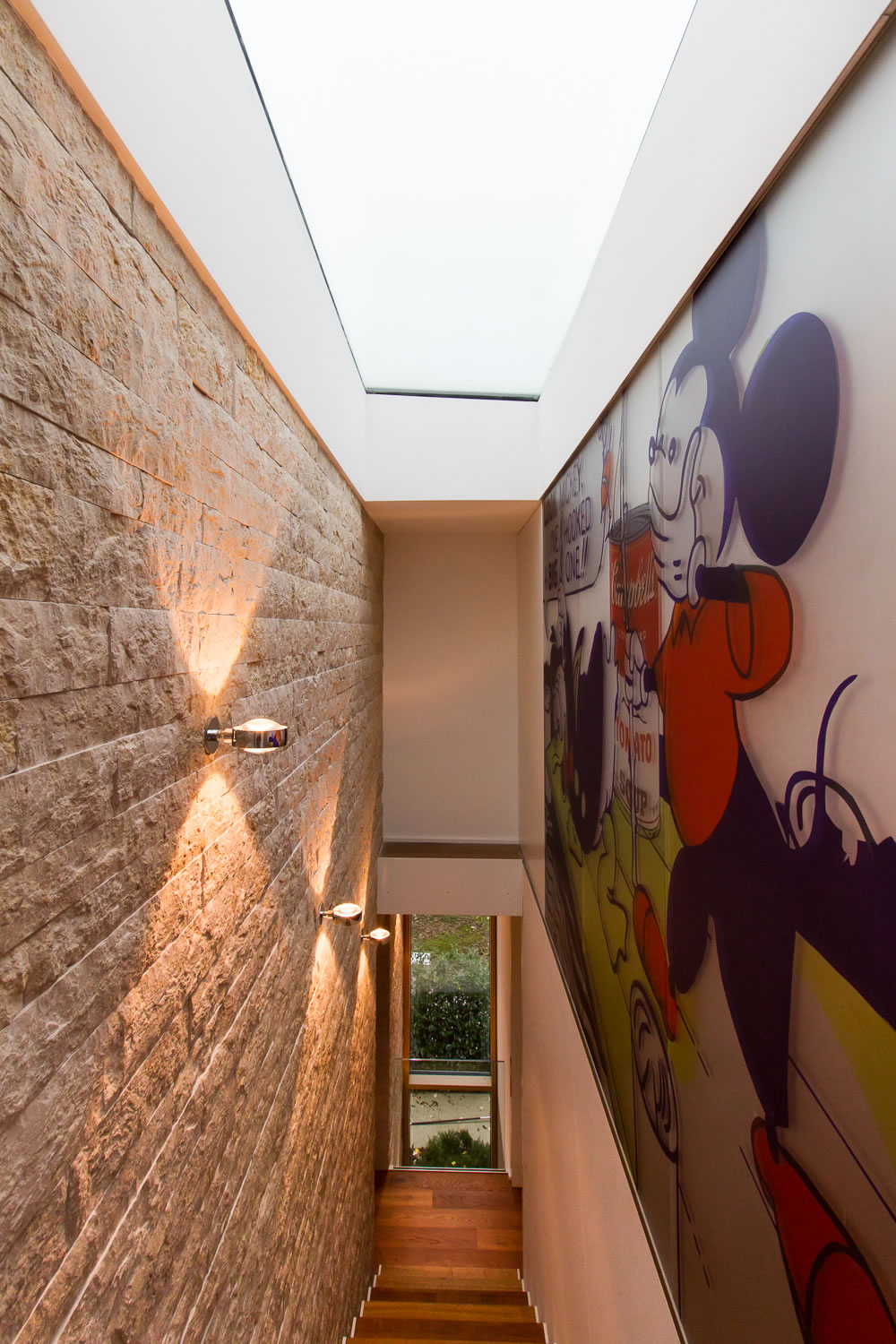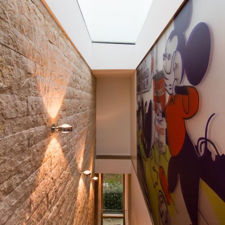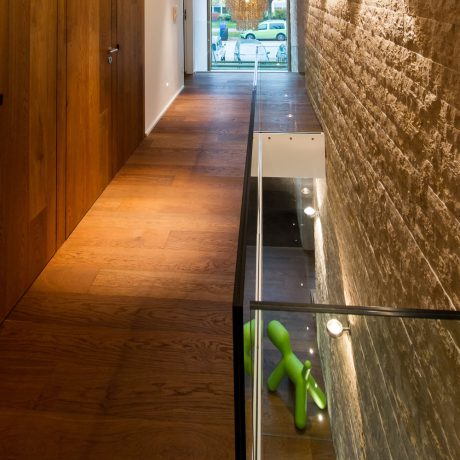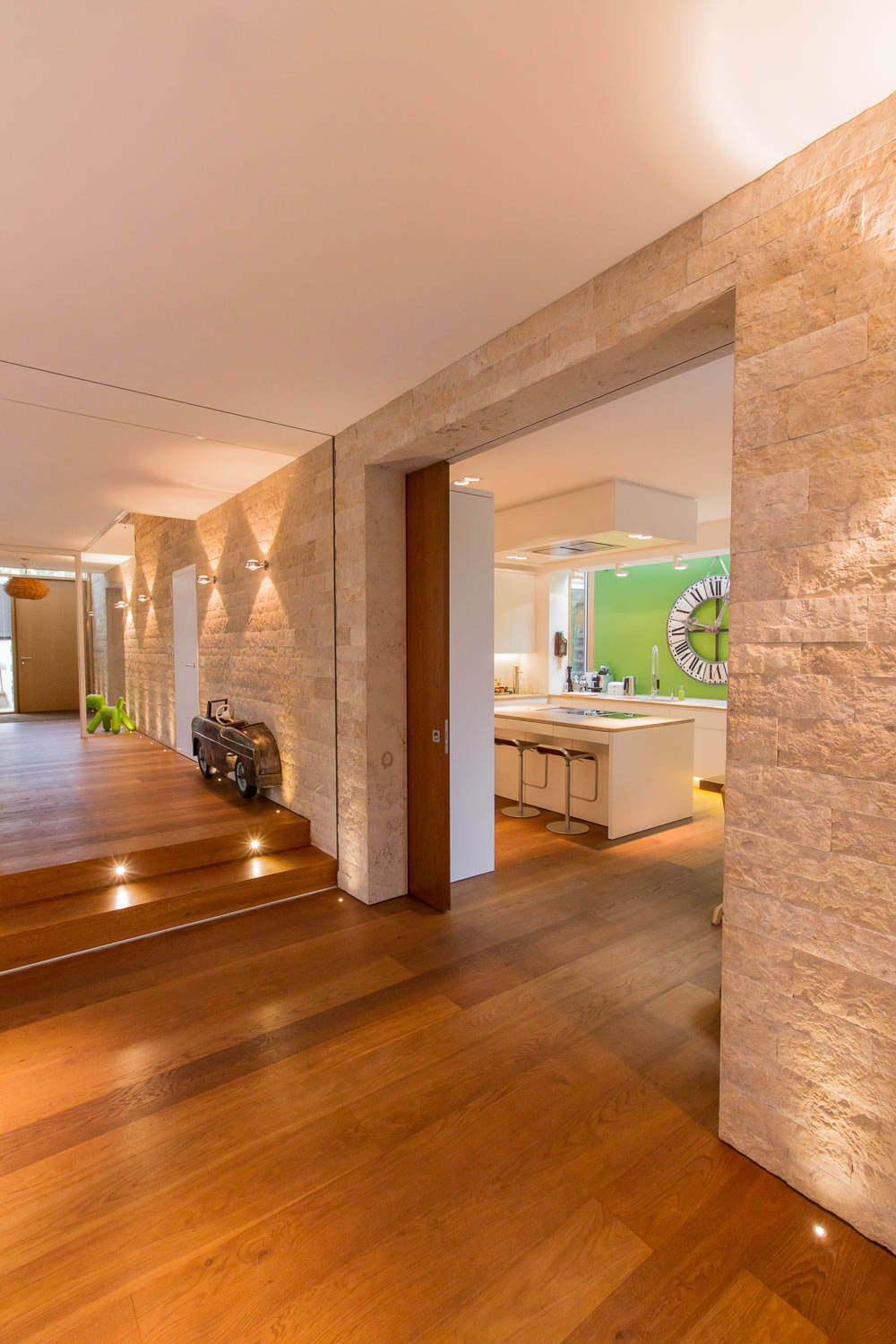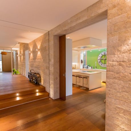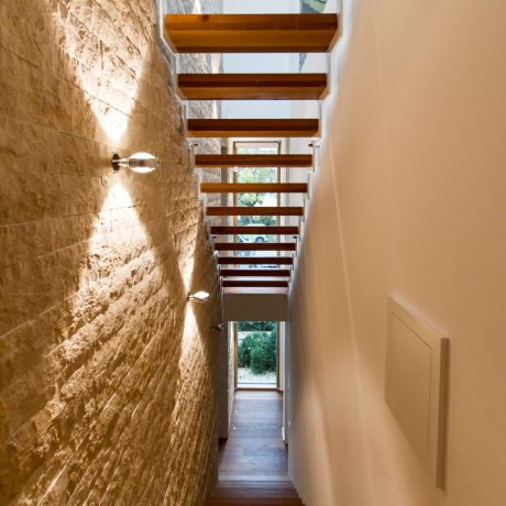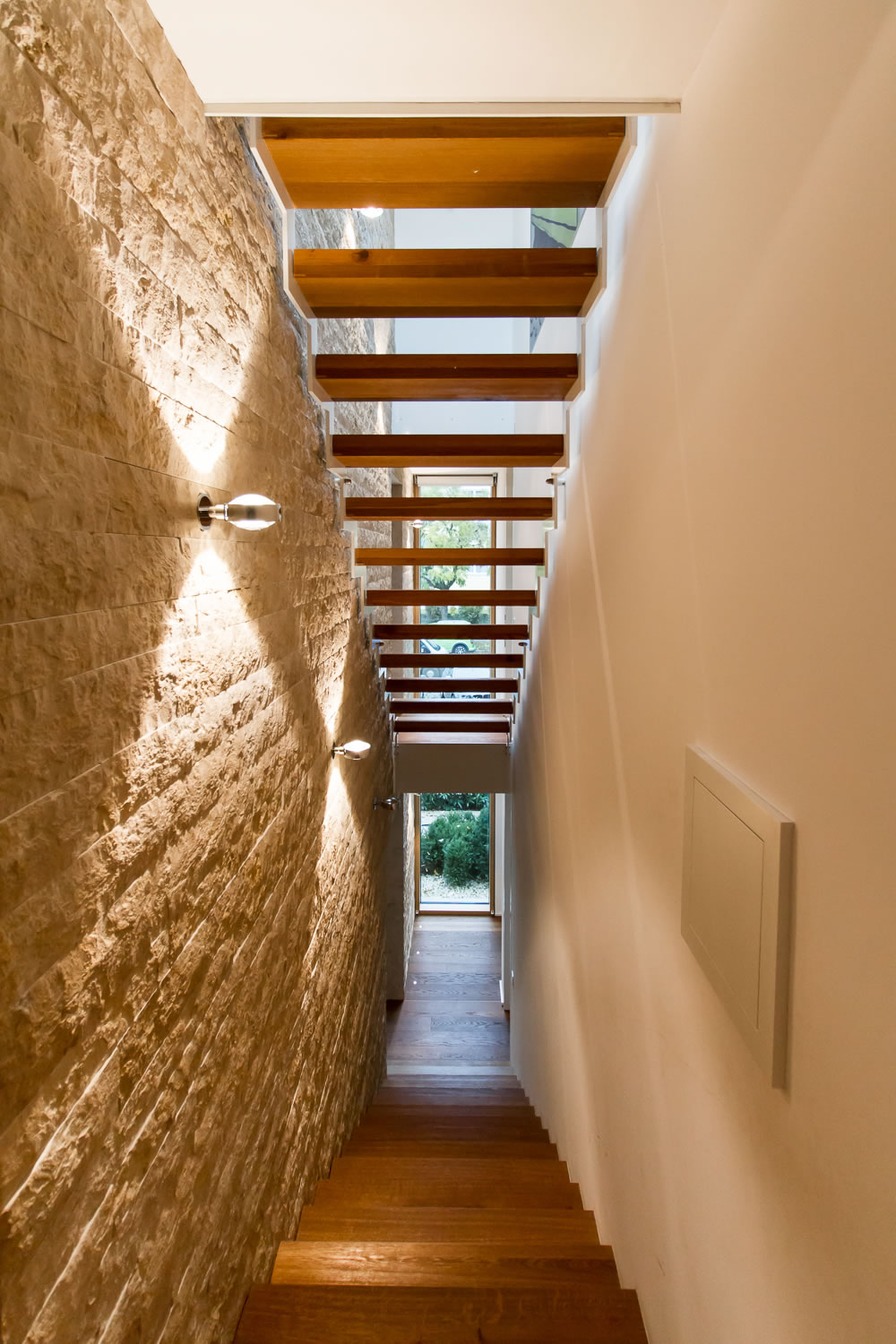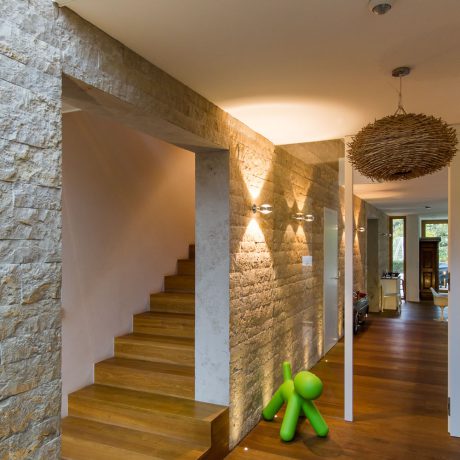 Prägendes Element ist eine längs durch das gesamte Haus verlaufende Natursteinwand, die die Trennung zwischen Wohn- und Nebenräumen bildet.