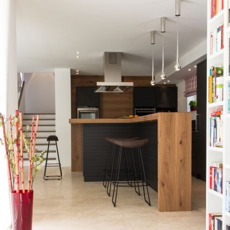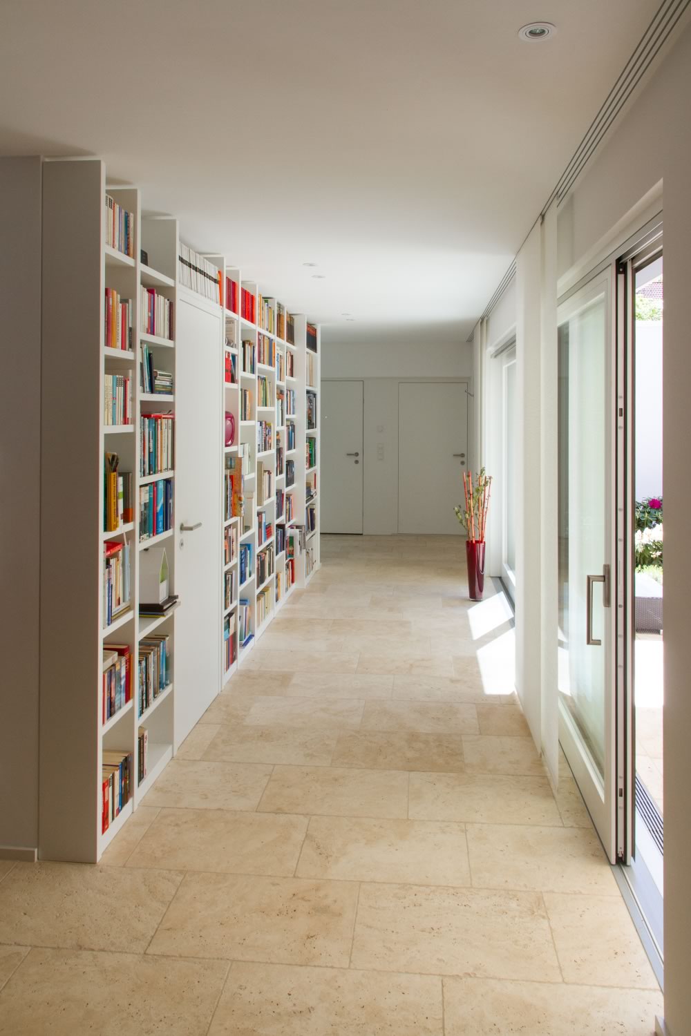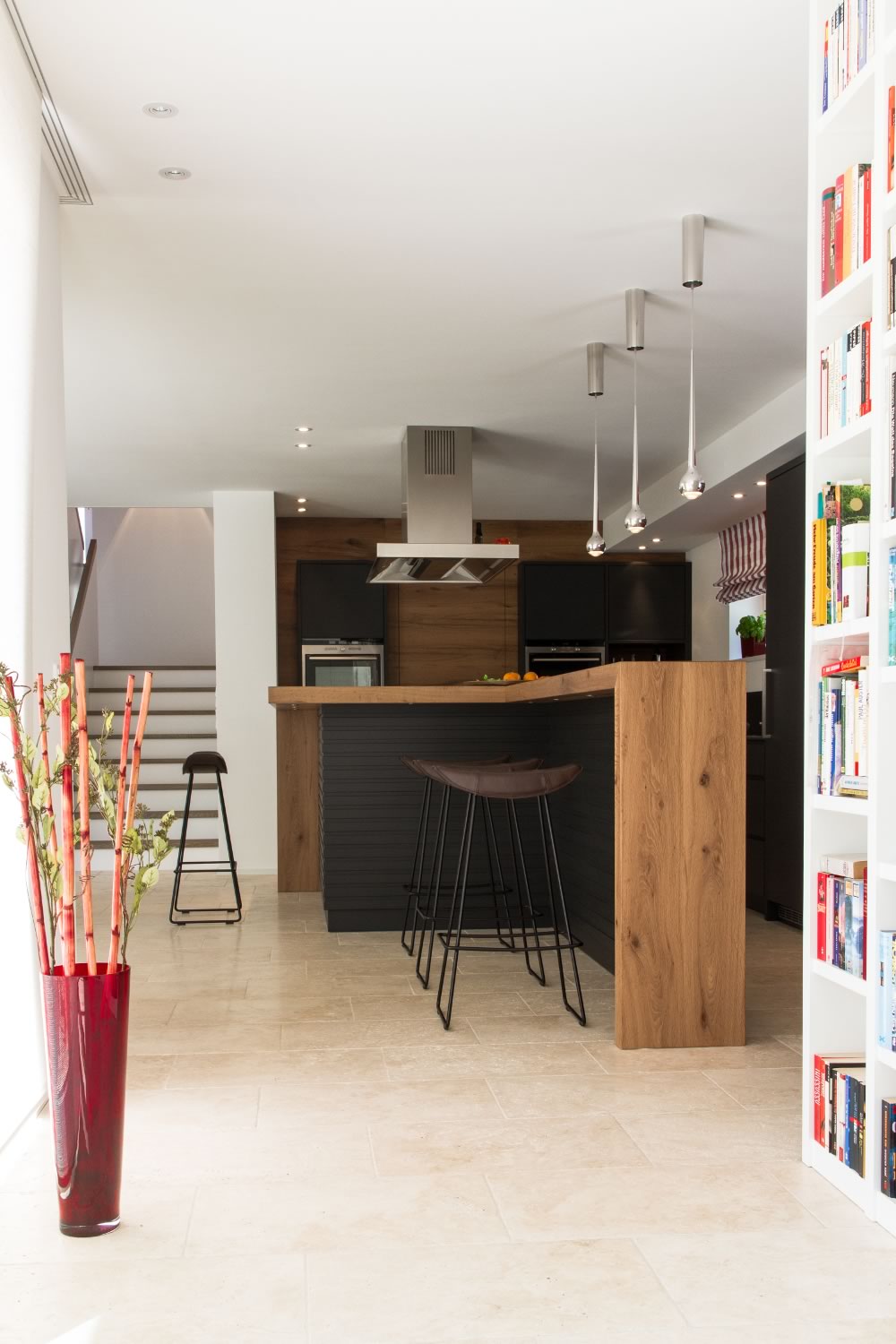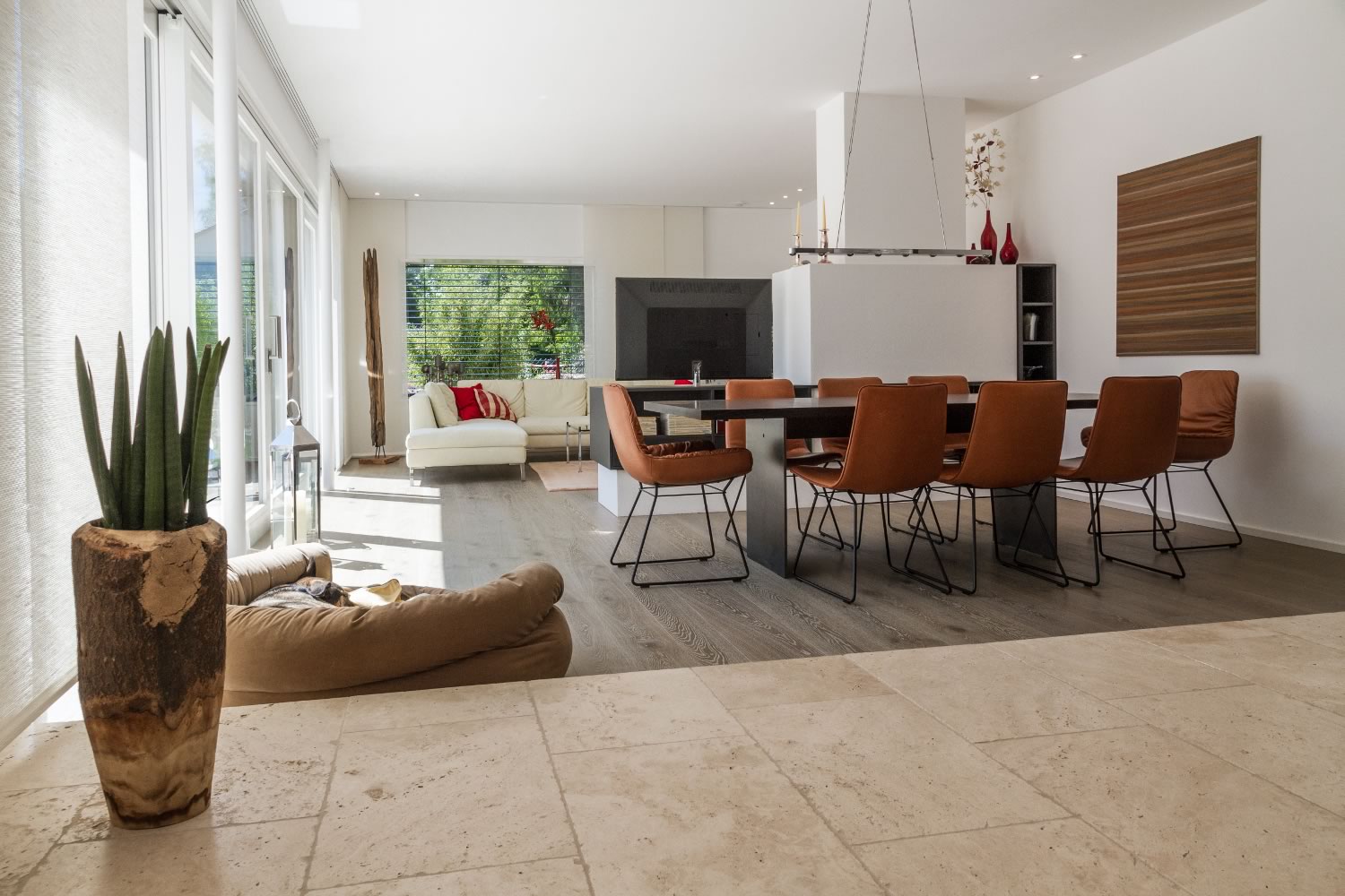 Die Innenräume sind ruhig und zurückhaltend in hellen Beige- und Weißtönen gestaltet, lediglich die großzügige Küche, die zugleich das Zentrum des Lebensbereiches bildet, bietet einen deutlichen Kontrast zur übrigen Farbgebung.