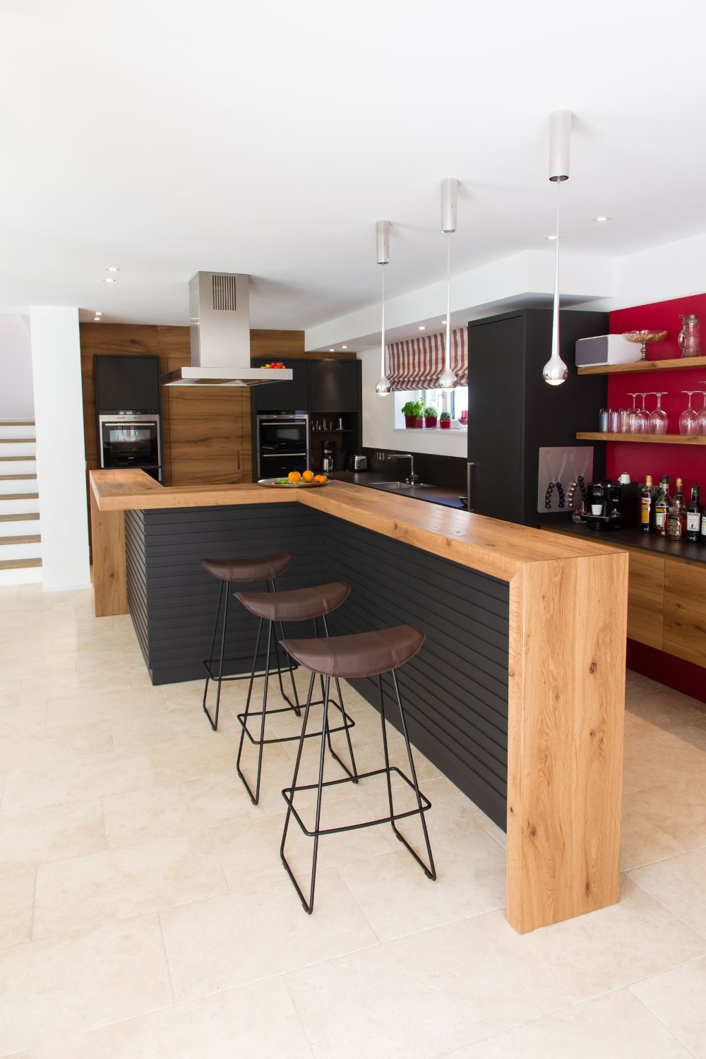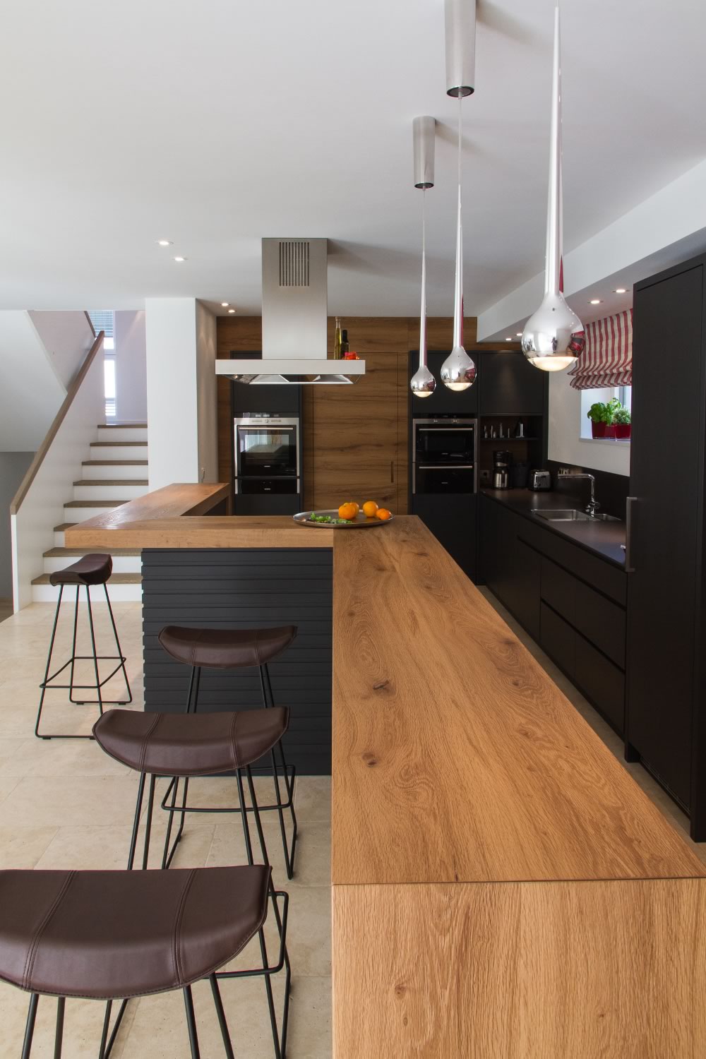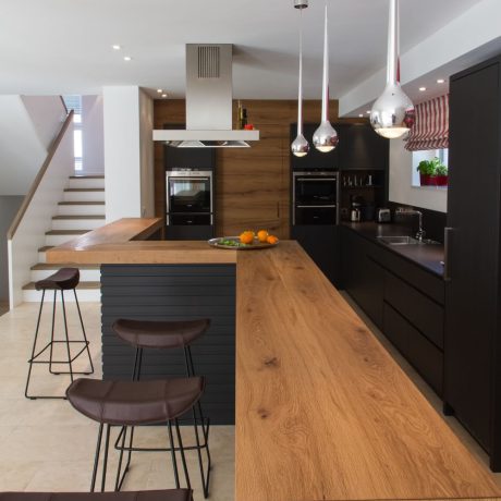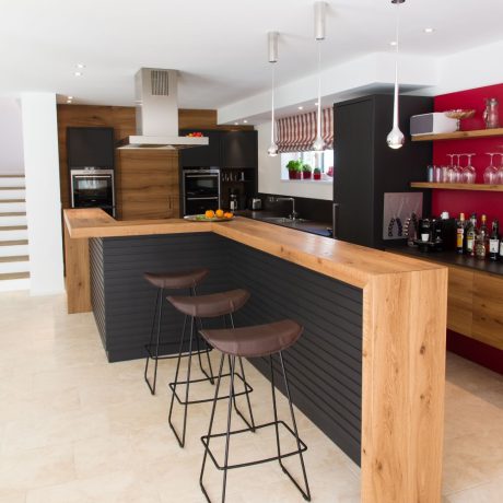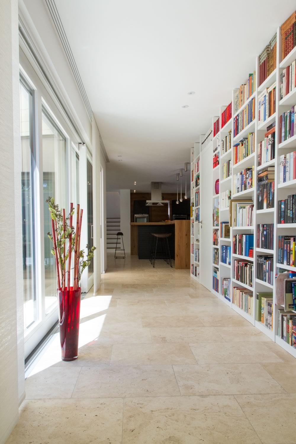 Die Innenräume sind ruhig und zurückhaltend in hellen Beige- und Weißtönen gestaltet, lediglich die großzügige Küche, die zugleich das Zentrum des Lebensbereiches bildet, bietet einen deutlichen Kontrast zur übrigen Farbgebung.