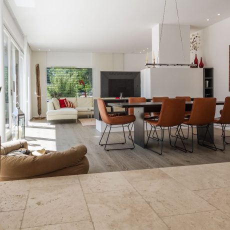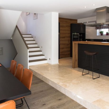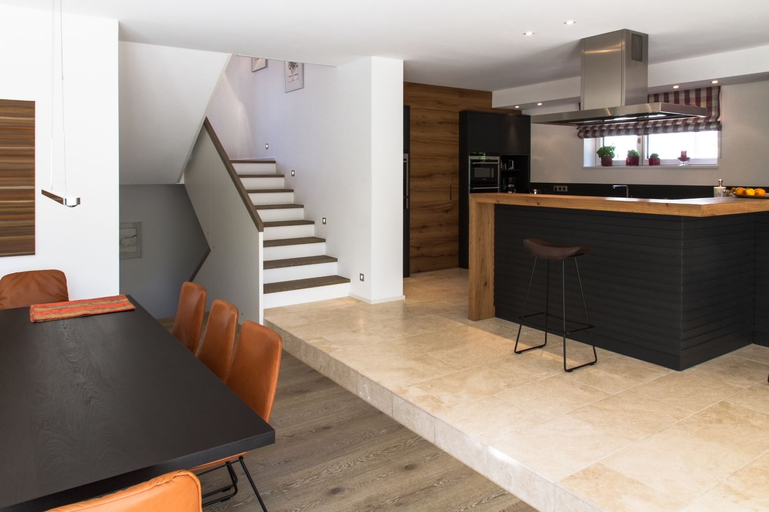 Der Wohn- und Essbereich wurde um eine Stufe abgesenkt, wodurch der Lebensraum im Erdgeschoß in einen halböffentlichen und einen privaten Bereich zoniert wird.