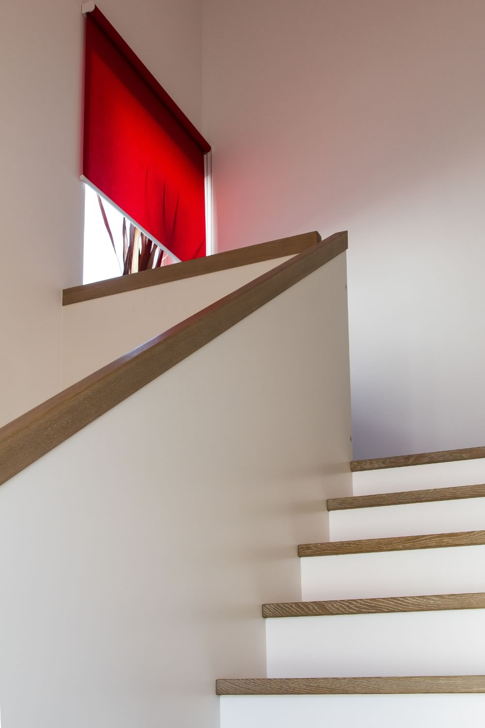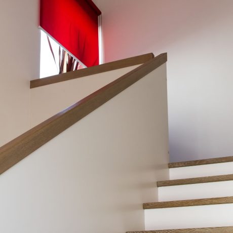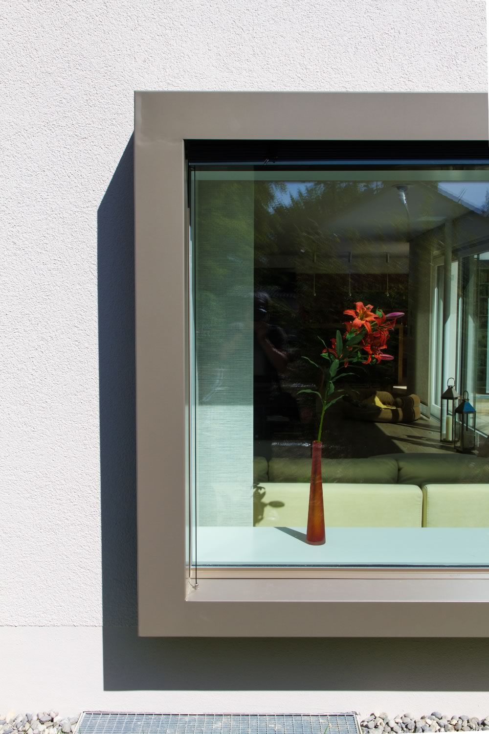 Die Öffnungen im Baukörper sind sehr bewusst gesetzt. Zu den Nachbargrundstücken hin werden nur sehr gezielte Ein- und Ausblicke gewährt, während sich die Wohn- und Schlafräume zum privaten Innenhof großzügig öffnen. Zusätzlich werden einzelne Öffnungen durch Leibungsrahmen aus Blech betont, das Fenster wird zum Gestaltungselement auf der Fassade.