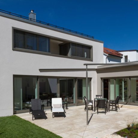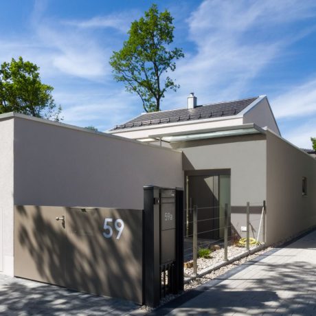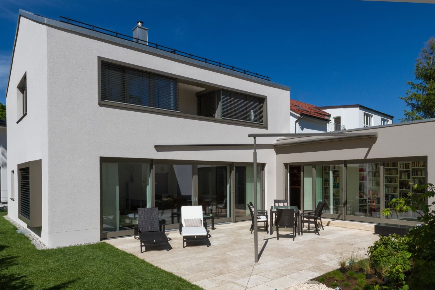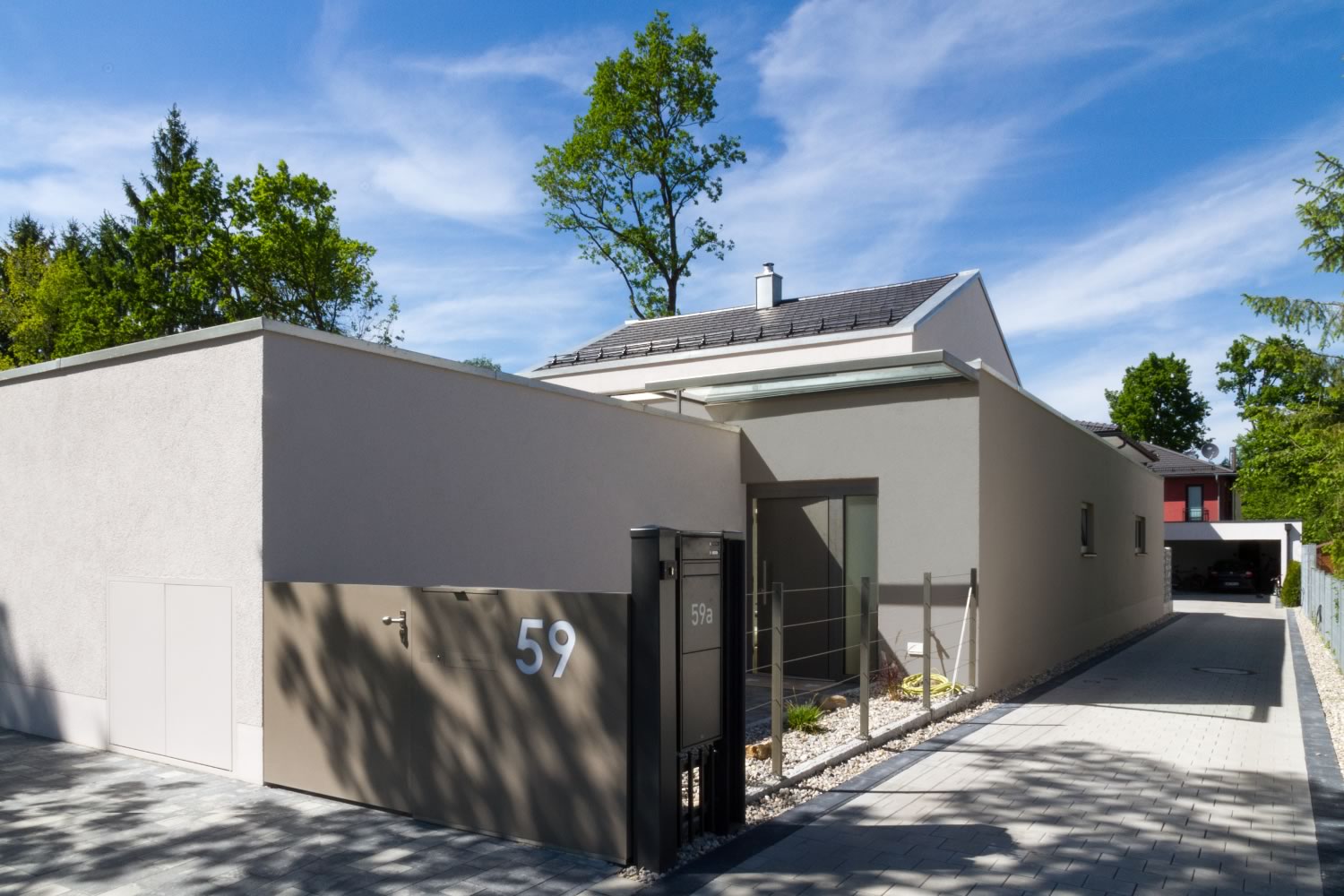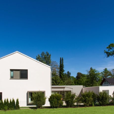Das Einfamilienhaus in einem Vorort von München setzt sich aus drei Baukörpern zusammen. Das Ensemble aus Satteldachhaus, Eingangsanbau und Garage bildet einen intimen Innenhof, in dem sich die Terrasse und somit die Hauptaufenthaltsfläche des Gartens befindet.
