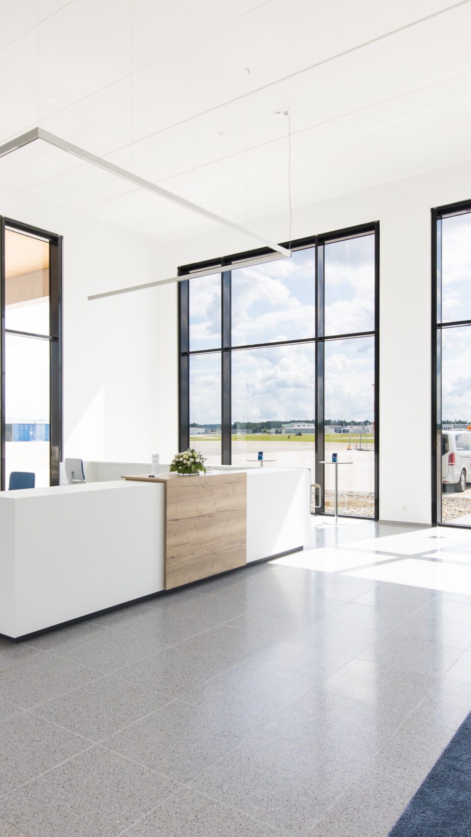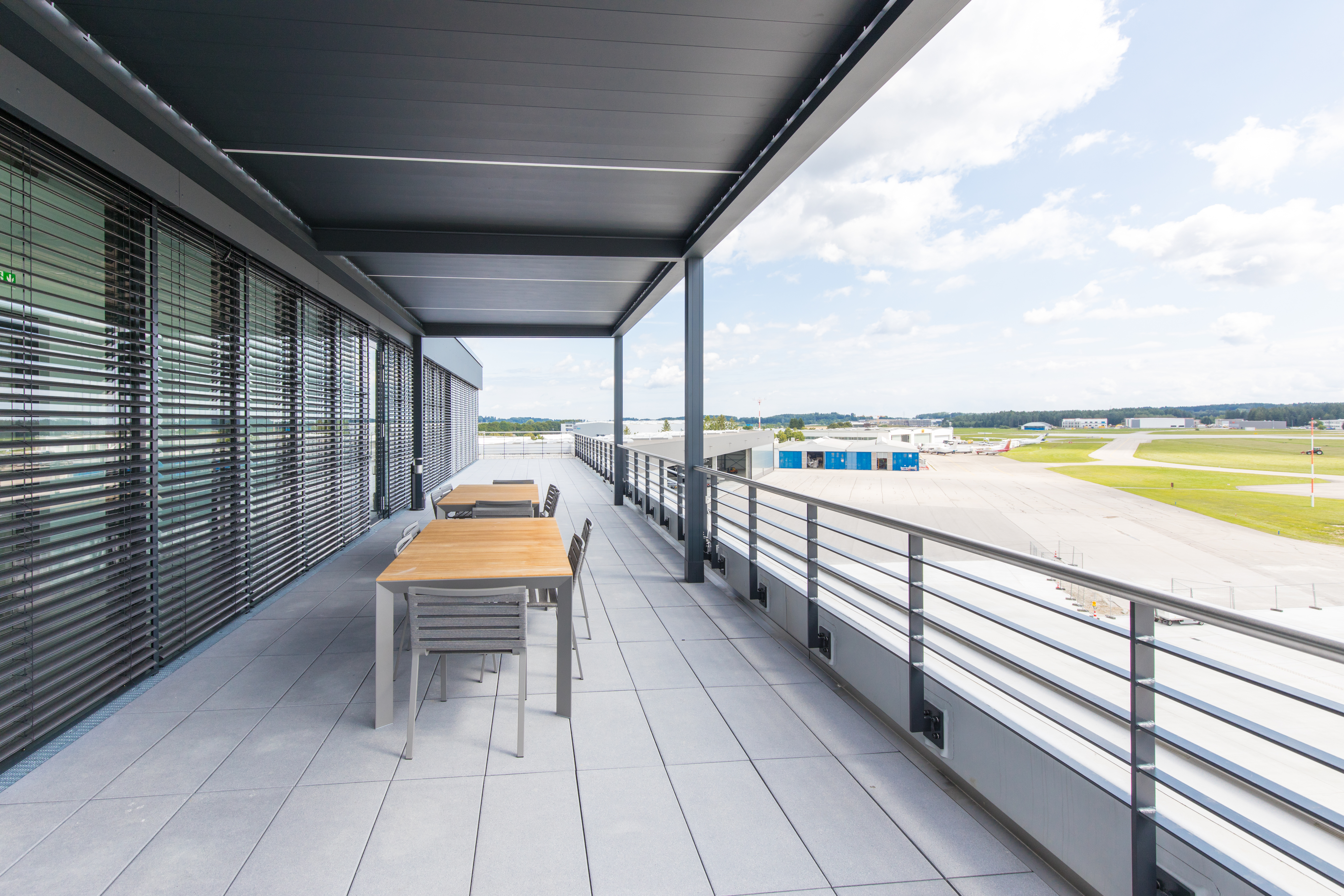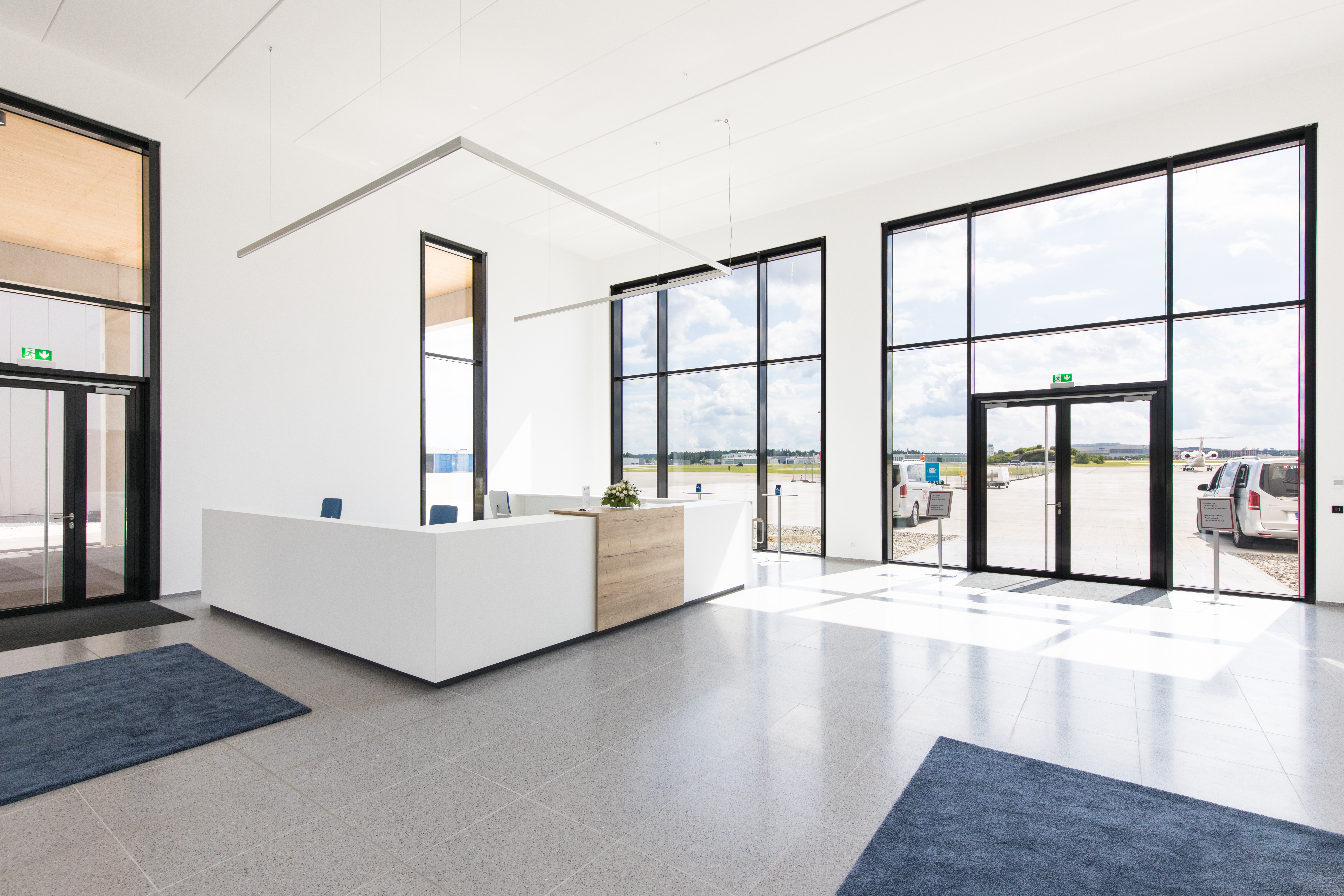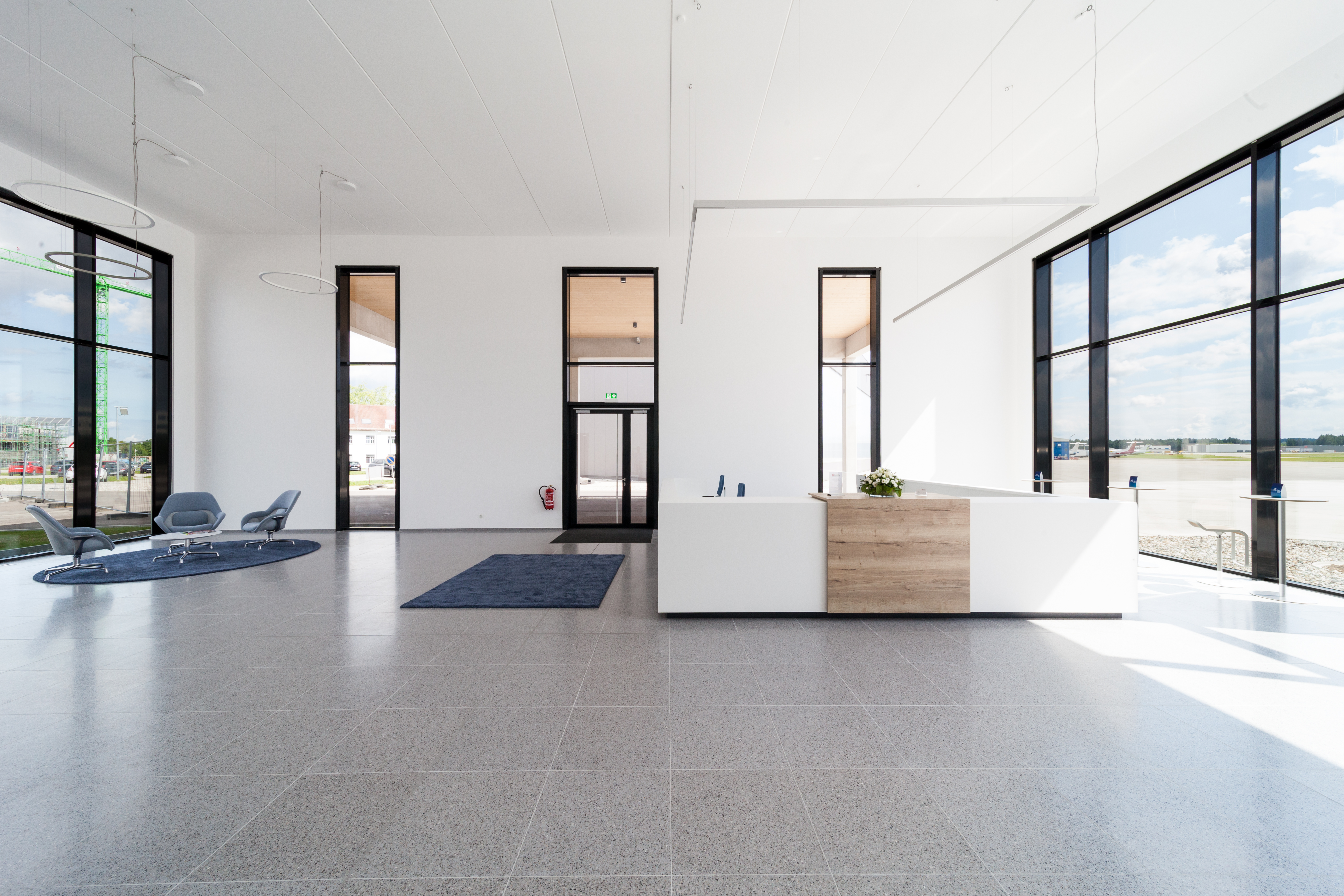 Am Flughafen Oberpfaffenhofen entstand auf Grund des wieder verstärkt auftretenden Flugverkehraufkommens der Bedarf an einem repräsentativen Empfangsgebäude mit Wartelounge für die Fluggäste sowie zur Unterbringung der Flughafenverwaltung. Weiterhin sollten Meeting- und Veranstaltungsräume zur internen und externen Nutzung mit direktem Sichtbezug zum Flugfeld geschaffen werden.