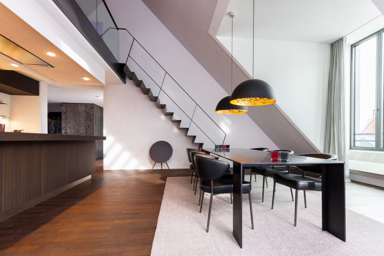 Das Raumkonzept einer zweigeschossigen Dachgeschoßwohnung wurde planerisch überarbeitet und die Einheit im Zuge der Umbaumaßnahmen in Teilbereichen entkernt. Konzeption und Gestaltung der Innenarchitektur entstand in enger Zusammenarbeit mit den Neuen Werkstätten in München.