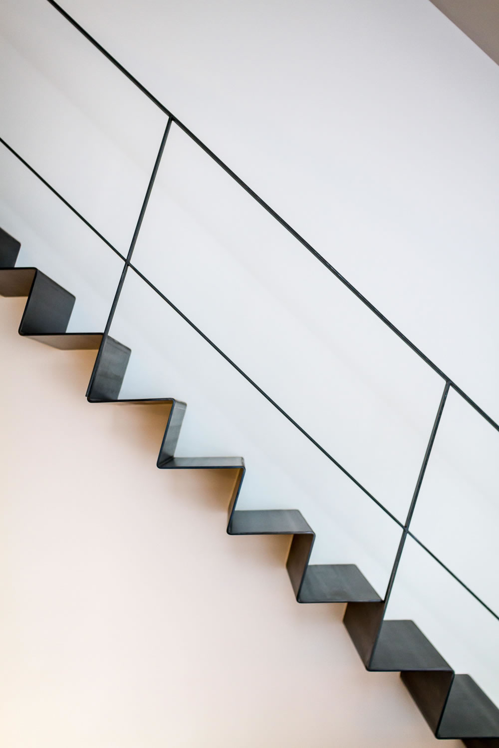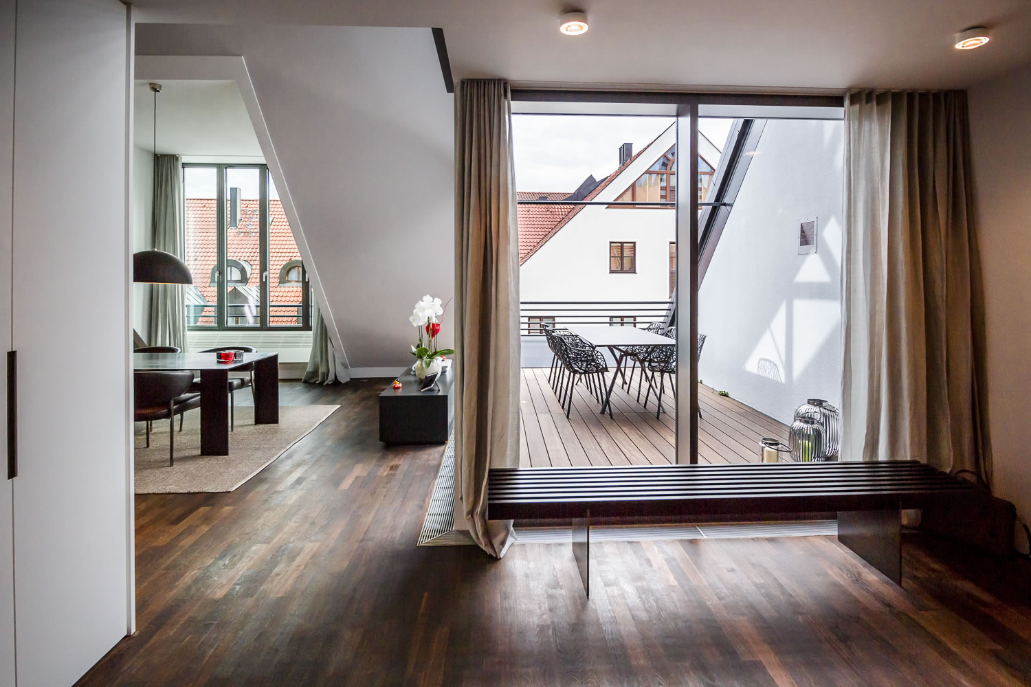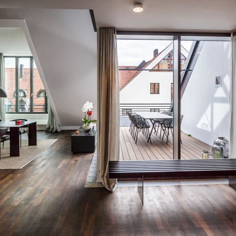 Das Raumkonzept einer zweigeschossigen Dachgeschoßwohnung wurde planerisch überarbeitet und die Einheit im Zuge der Umbaumaßnahmen in Teilbereichen entkernt. Konzeption und Gestaltung der Innenarchitektur entstand in enger Zusammenarbeit mit den Neuen Werkstätten in München.