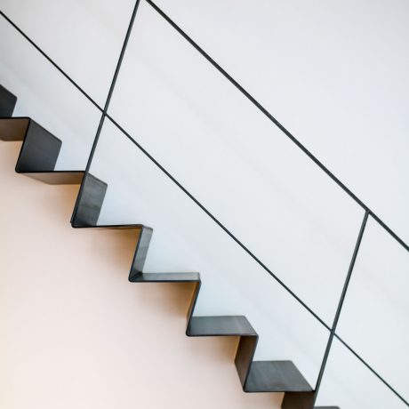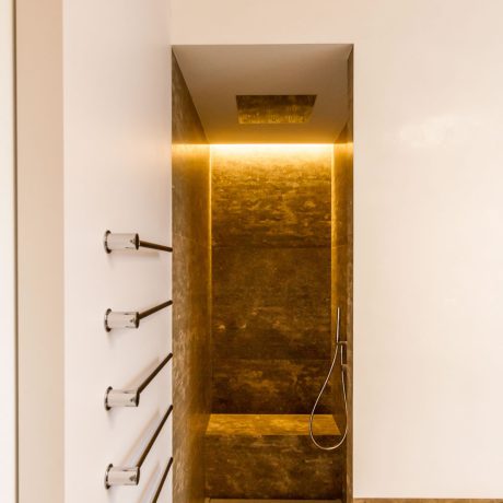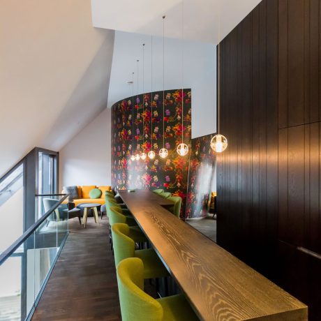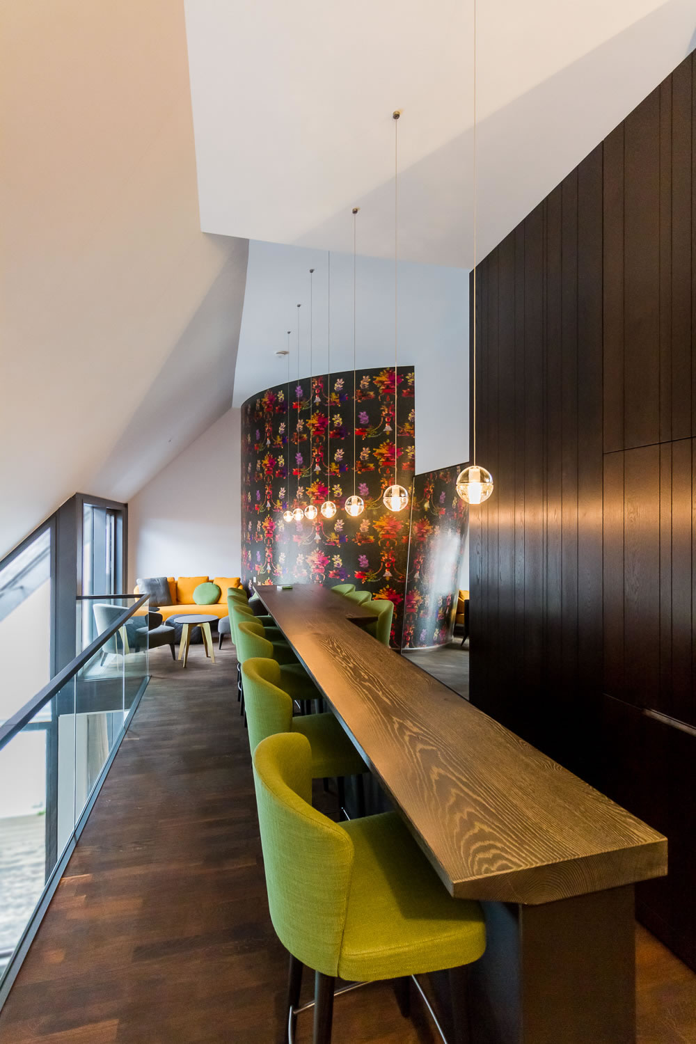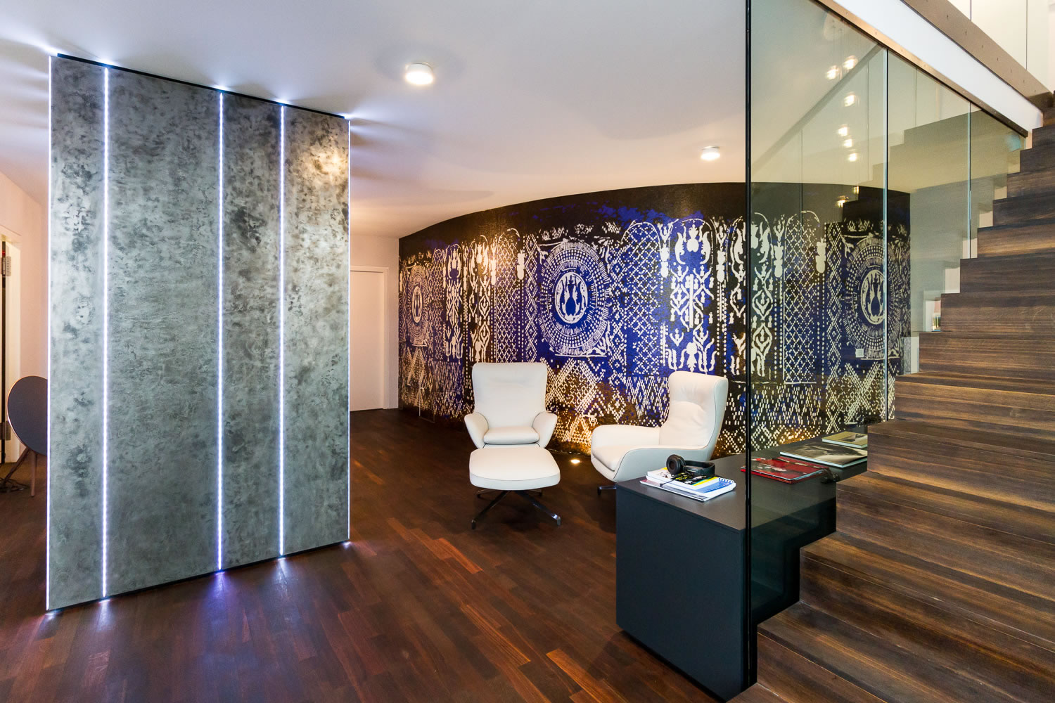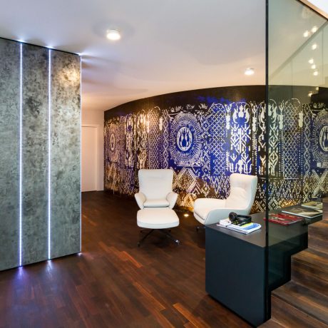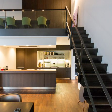 Durch den Wechsel des Hauptzugangs entstand eine klare Raumfolge von Eingang, Wohnküche und Lounge zum „privaten“ Teil der Wohnung. Die zwei Galerieebenen lassen die imposante Raumhöhe von fast sieben Metern zur Geltung kommen. Die vertikal durch die Einheit „durchgesteckten“ Tapetenwände betonen diese Raumhöhe zusätzlich und schaffen eine gestalterische Verbindung der beiden Ebenen. Im Rahmen des Umbaus wurde auch die Lichtplanung überarbeitet und den neuen Anforderungen angepasst. Durch die individuelle Planung von Schreinermöbeln korrespondiert die schlichte Eleganz der Einbauten mit der ausgesuchten, eleganten Farbpalette aus gedeckten Tönen und farbigen Akzenten der Tapetenwände.
