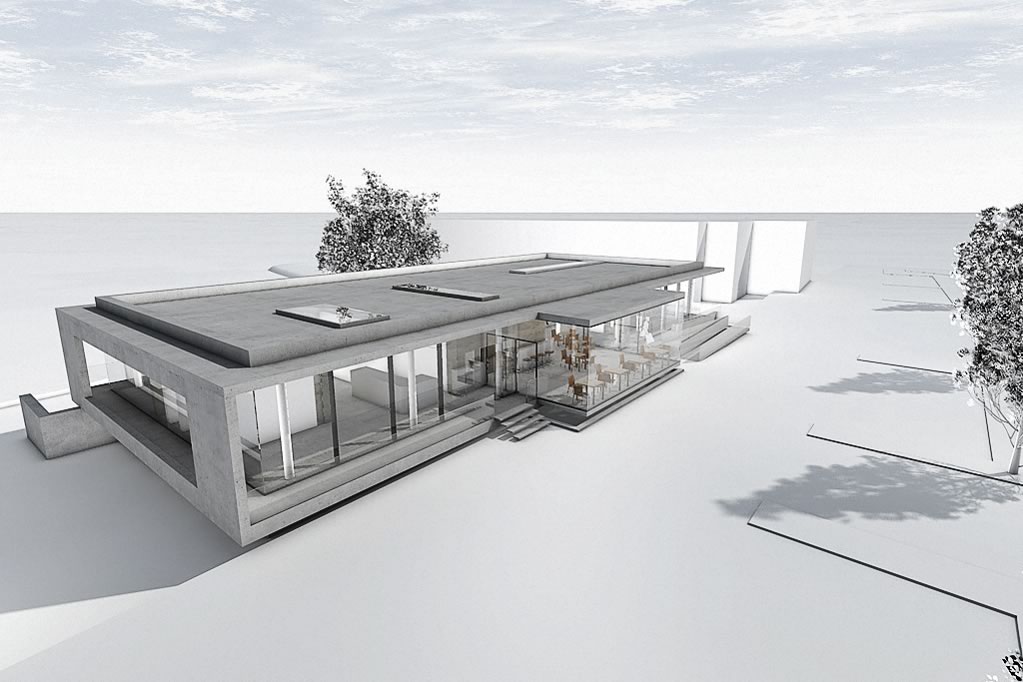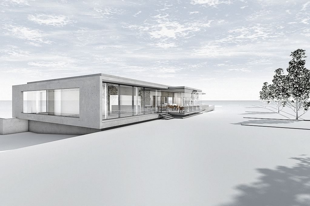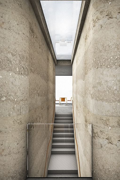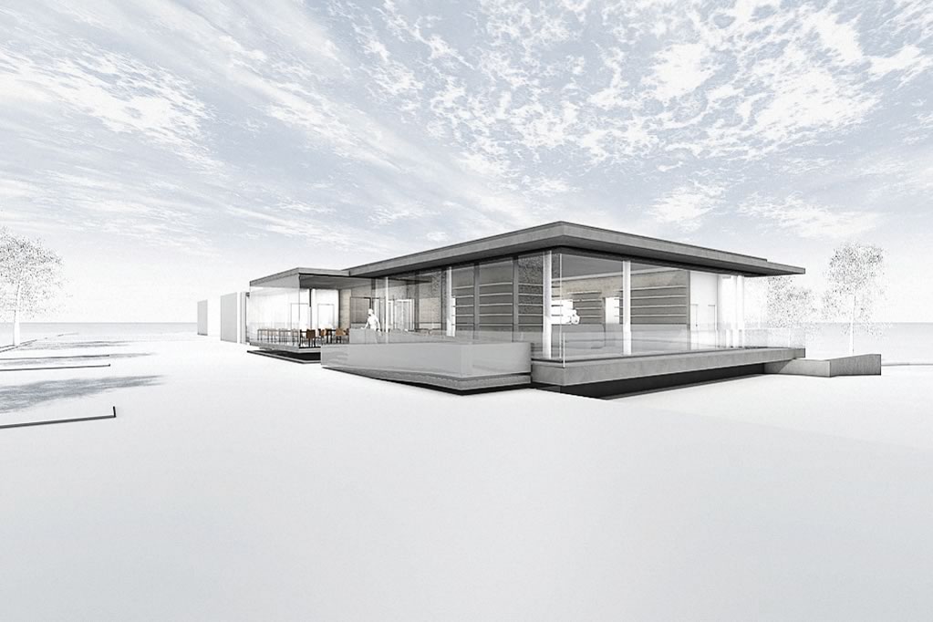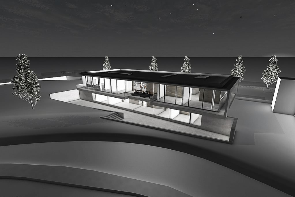 Das Gebäude nutzt die Hanglage des Grundstücks aus und wirkt daher trotz seiner Größe zur Straße hin flach und pavillonartig. Rückseitig öffnen sich die Artzpraxen in eine naturbelassene, private Parklandschaft mit Weiher und Bachlauf. Großflächige Verglasungen ermöglichen tiefe Durch- und Einblicke und lassen das Gebäude leicht, schwebend, transparent und einladend wirken. Diese Offenheit wird auch im inneren Raumkonzept fortgeführt: Die Nutzungseinheiten werden lediglich von dem durch das gesamte Haus laufende Stampflehmband unterteilt und zoniert.